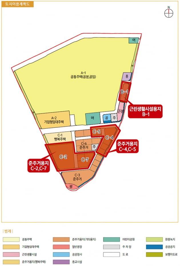 공급대상 토지는 준주거용지 C-2·4·5·7블록 9필지와 근린생활시설용지 B-1블록 2필지로, 일반 실수요자 대상으로 공급된다. 준주거용지 필지당 면적은 1029~1만4846㎡, 공급 예정금액은 3.3㎡당 1716만~1999만원 수준이다. 건폐율 70%와 용적률 500%가 적용된다. 근린생활시설용지 2필지는 필지당 면적이 각각 982㎡, 998㎡이고 공급예정가격은 3.3㎡당 1491만원·1475만원씩이다. 건폐율은 60%, 용적률은 250%로 지을 수 있다.