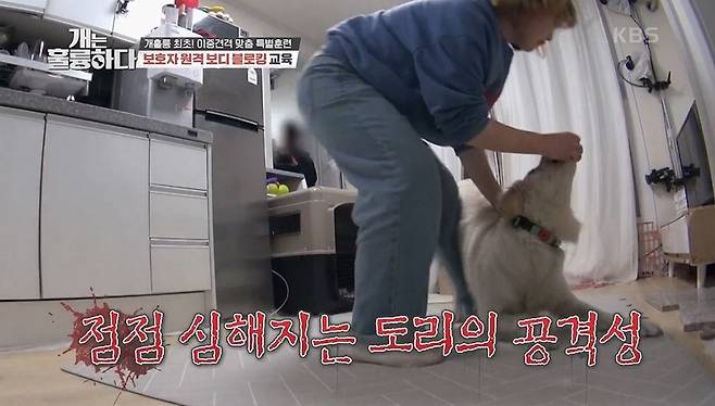 블로킹 훈련이 계속되던 중 도리가 이빨을 보이며 앞발을 들고 언니 보호자를 공격했다. 정말 위험한 상황이었다. 도리의 공격성은 점점 심해지고 있었다. 더 이상 지켜볼 수 없다고 판단한 강 훈련사는 상황실을 뛰쳐나갔고, 집 안으로 들어가자마자 도리를 강력하게 제압했다. 강 훈련사는 보호자가 강한 마음을 가져야 한다고 강조했다. 더 이상 만만하게 보여선 곤란했다.