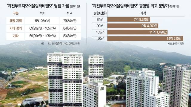◇‘만점’ 통장까지 나온 과천 지정타=10일 한국감정원에 따르면 이날 청약 당첨자를 발표한 경기 과천 지정타 ‘푸르지오어울림라비엔오’에서 만점(84점) 통장이 나왔다. 해당 통장은 전용 84㎡E 기타 경기 전형에 접수됐다. 84점은 부양가족 6명 이상(35점), 무주택기간 15년 이상(32점), 청약통장 가입기간 15년 이상(17)을 모두 충족해야 받을 수 있는 점수다. 해당 평형의 기타 경기 당첨자 평균 가점은 78.9점에 달했다. 고가점자들이 대거 몰린 셈이다.