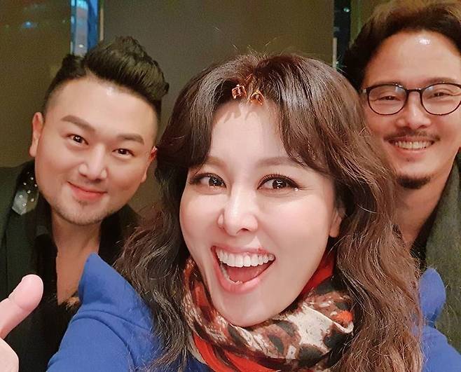 사진 속 홍지민은 뮤지컬 배우 남경주와 성악가 류하나와 환히 웃고 있다.
