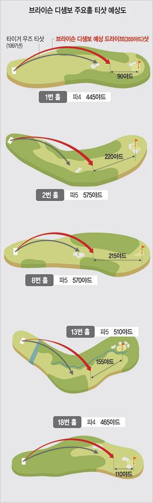 미국의 골프닷컴은 1997년 우즈가 마스터스에서 처음 우승할 당시 주요 홀 티샷을 참고해 디섐보의 장타력을 바탕으로 한 예상 홀 공략도까지 제시했다. 디섐보는 지난달 열린 메이저대회 US오픈에서 가공할 만한 장타력을 앞세워 정상에 올랐다. 당시 평균 비거리 344야드로 1위에 오르더니, 얼마 전엔 훈련하며 드라이버로 403야드를 넘겼다.