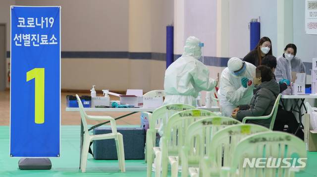 [전주=뉴시스] 김얼 기자 = 전주시가 요양병원 등의 신종 코로나바이러스 감염증(코로나19)에 취약한 고위험군 시설을 대상으로 전수조사를 시작한 11일 전북 전주시 전주화산체육관 선별진료소에서 의료진들이 시민들을 대상으로 검체 채취를 하고 있다. 2020.11.11.
