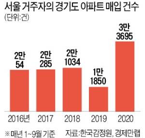 서울 거주자가 경기지역 아파트를 매입한 건수가 역대 최고인 것으로 나타났다. 지난 7월 말 새 임대차보호법 시행 이후 전세난이 심화하면서 서울 아파트 전세 수요가 경기 아파트 매입 수요로 옮겨 간 것으로 해석된다.