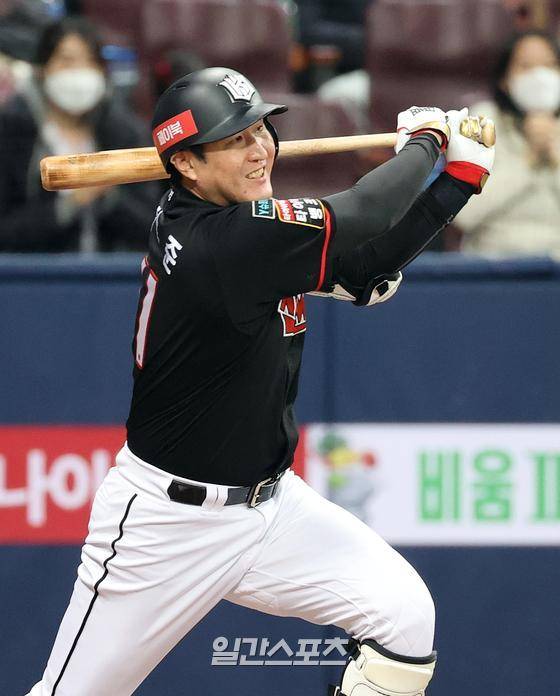 프로야구 2020 KBO 포스트시즌 두산베어스와 kt위즈의 플레이오프 3차전이 12일 오후 서울 고척스카이돔에서 열렸다. 8회초 2사 1,3루 유한준이 1타점 적시타를 치고 있다.