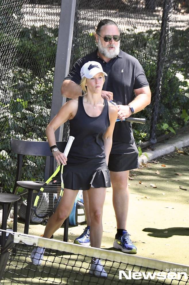 할리우드 배우 러셀 크로우는 11월 11일(현지시간) 금발의 새 여자친구 브리트니 테리엇과 함께 테니스를 즐겼다.