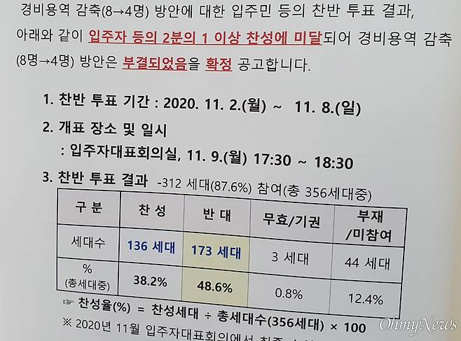 이러한 노력은 입주자 과반수가 '상생'을 선택하는 결과로 이어졌다. 지난 9일 개표에서 '경비원 감축' 반대(48.6%, 173세대)가 찬성(38.2%, 136세대)을 넘겨 결국 안건이 부결된 것이다.