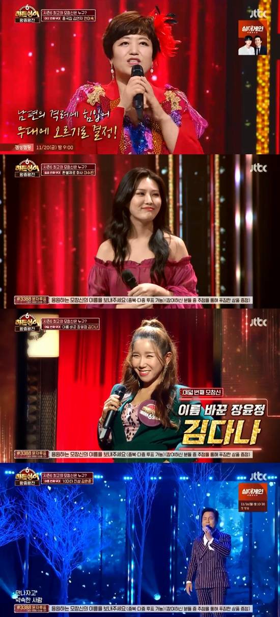 '이름 바꾼 장윤정' 김다나는 1,702점으로 7위에 올랐다. '목소리 대역 김종국' 조준호는 5단계 상승한 6위를 기록했다. '오늘밤 김완선' 김은영은 1,763점으로 TOP5에 올랐다. 4위는 1,813점의 '중국집 김연자' 안이숙이 차지했다.