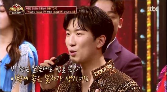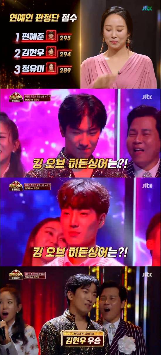 왕중왕전, 킹 오브 히든싱어는 바로 '일희일 비' 김현우. 강력한 우승후보였던 '노래방에서 장범준' 편해준을 꺾고 1,923점을 획득했다. 1,896점을 얻은 편해준을 높은 점수 차로 이긴 것.