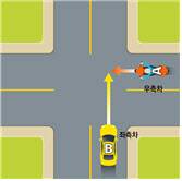 다음은 같은 차로에서 차량이 선행해 우회전 하던 중, 뒤에서 직진하려는 오토바이와 사고가 날 경우다. 사실상 선행 차량의 틈새로 운행을 하고 있던 셈이다. 하지만 해당 사고의 과실비율은 오토바이 60%, 차량이 40%다. 오토바이가 좁은 공간으로 주행이 가능한 점을 이용해 선행 중인 차량의 우측으로 진행하다 낸 사고인 만큼 오토바이의 과실이 중하지만, 선행 자동차도 주의의무를 다 하지 않았다는 설명이다. 선행해 달리는 차량이라도 교차로에서 좌우회전시에서 상당한 주의의무를 기울여 전후좌우를 두루 살펴야 한다.