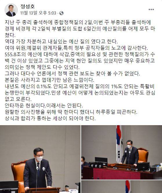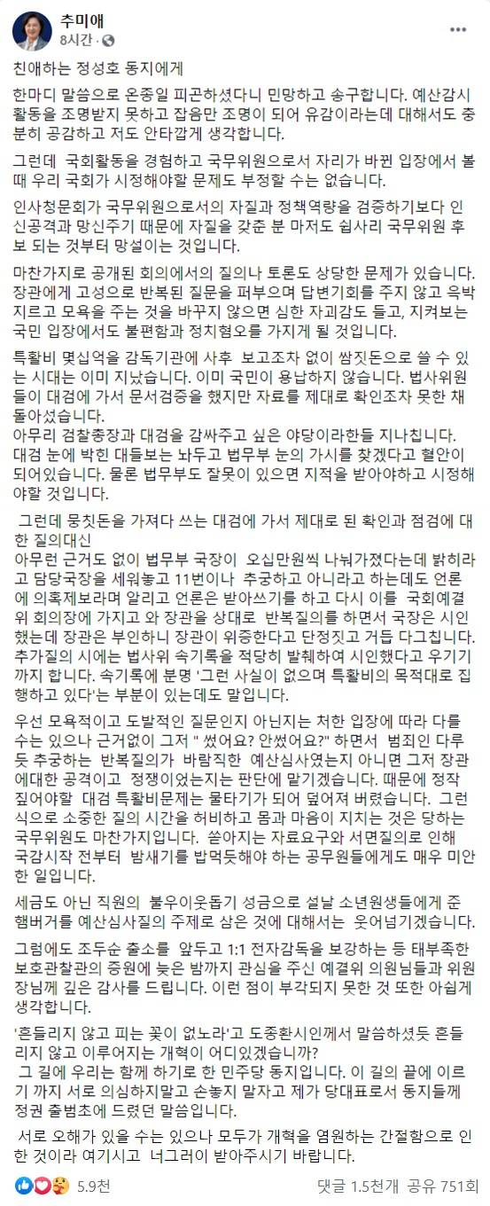 추 장관은 14일 오후 자신의 페이스북에 “친애하는 정성호 동지에게”라고 시작되는 장문의 글을 올렸다. “한마디 말로 온종일 피곤했다니 민망하고 송구하다”고 한 추 장관은 “예산 감시 활동을 조명받지 못하고 잡음만 조명돼 유감이라는 데 대해 충분히 공감하고 나도 안타깝게 생각한다”고 했다.