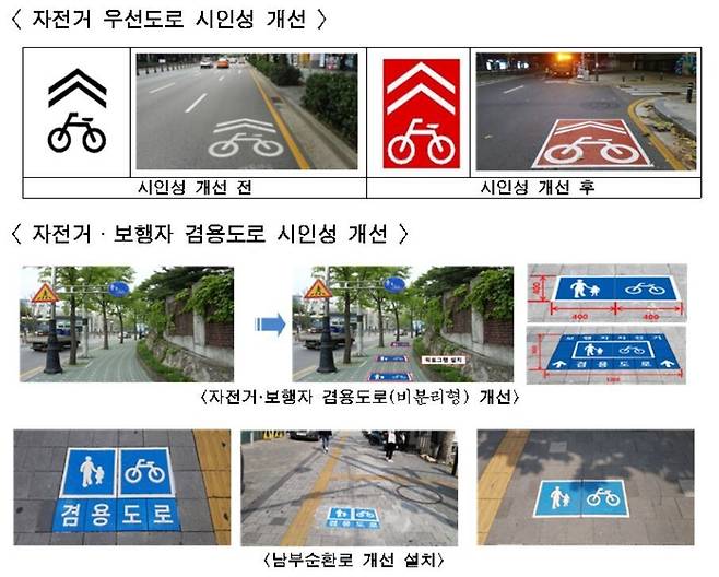 개선 작업이 이뤄지는 도로는 ‘자전거 겸용도로’다. 자전거 전용도로(총연장 207.6㎞)와 구분되는 ‘자전거 겸용도로’는 차도와 구분이 없이 차량과 자전거가 함께 다니는 ‘자전거 우선도로’(총연장 111㎞)와 보도에 자전거와 보행자가 함께 통행하는 ‘자전거·보행자 겸용도로’(분리형·비분리형으로 구분)가 있다.