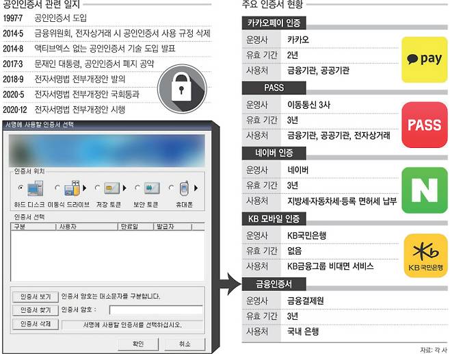 인터넷 초기인 1999년 7월 도입돼 복잡한 비밀번호 체계와 보안프로그램 설치 요구로 불만을 빚었던 공인인증서가 21년 만에 역사 속으로 사라진다. 공인인증서의 독점권을 폐지하는 내용의 전자서명법 개정안이 다음달 10일부터 발효된다. 앞으로 ‘공인인증서’라는 표현 자체가 사라지고, ‘사설’ 인증서들이 본격적인 시장 경쟁을 벌일 것으로 전망된다.