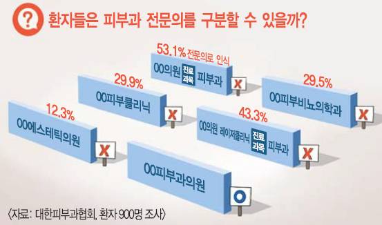 이상준 대한피부과의사회 회장은 “문제는 비피부과 전문의나 일반의 의원이 진료과목을 잘 보이지 않도록 작게 내지는 눈에 잘 띄지 않는 색깔로 표기하거나 해당 부분의 조명을 꺼 놓는 등의 눈 속임으로 환자들에게 혼선을 주고 있다는 점”이라고 지적했다. 피부과의사회는 환자들의 전문의 여부 확인을 돕기 위해 웹사이트(www.akd.or.kr)에서 피부과전문의 검색 서비스를 운영 중이다. 또 병원 입구에 의사회가 인증한 피부과전문의 마크를 걸도록 하고 있다.