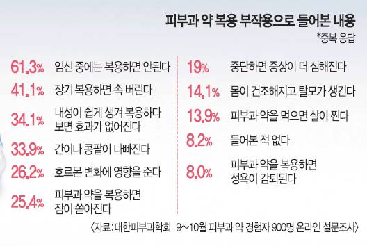 조사 대상자 900명 가운데 부작용을 겪었다는 응답자는 14.3%(129명)에 그쳤다. 부작용 경험 비율이 높지 않음에도 상당수는 일반 통념과 간접 경험으로 편견을 갖게 된 것이다. 지난해 국립의료원 지역의약품안전센터에 보고된 약물 부작용 4301건 가운데 피부과 약에 의한 것은 약 1%(43건)에 불과했다.