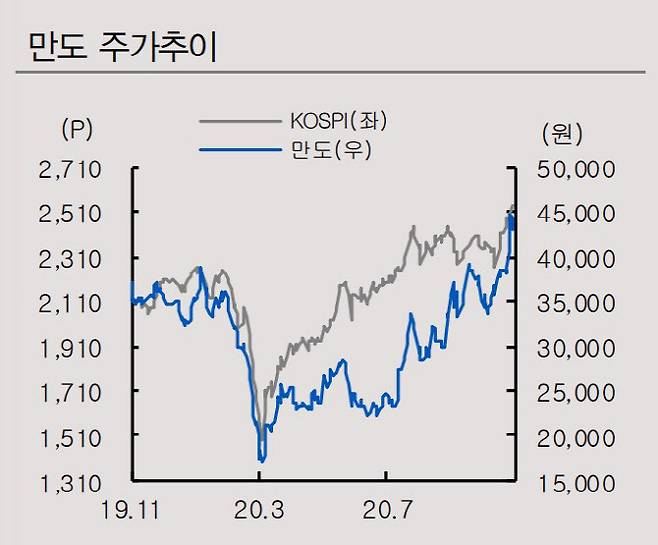 이 연구원은 "만도에 대한 투자의견 매수를 유지하며 목표주가는 4만9000원으로 상향한다"며 "2분기 코로나 및 구조조정 비용 등으로 큰 폭의 적자를 기록한 이후 3분기부터는 수익성이 빠르게 개선되고 있다. 특히 SUV 및 신차의 ADAS 장착률이 높아지면서 지속적으로 매출기여도가 높아지고 있으며 차세대 전자식 제품군의 성장동력도 기대된다"고 말했다.
