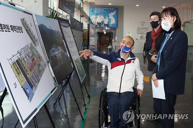 (서울=연합뉴스) 최윤희 문화체육관광부 제2차관이 18일 경기도 이천시 이천훈련원을 방문해 정진완 이천훈련원장으로부터 설명을 듣고 있다. 2020.11.18