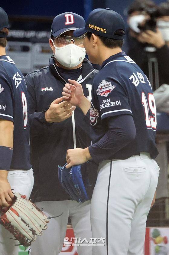 프로야구 2020 KBO 포스트시즌 NC다이노스와 두산베어스의 한국시리즈 2차전이 18일 오후 서울 고척스카이돔에서 열렸다. 5대 4로 승리한 두산 김태형 감독이 경기 종료 후 김민규를 맞이하고 있다.