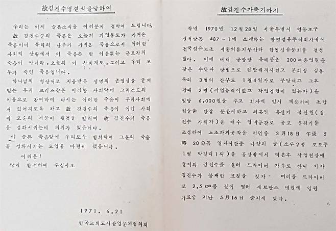 | ▲ 한국교회도시산업문제협의회 등이 주관한 고 김진수 영결식 안내 자료(1971년 6월 21일)는 “고 김진수 군의 죽음은 오늘의 기업 풍토가 가져온 죽음이며 폭력의 난무가 가져온 죽음”이라고 알리고 있다. 윤조덕 원장은 김진수 열사의 장례식에서 집행위원회 부위원장과 호상을 각각 맡았다. |