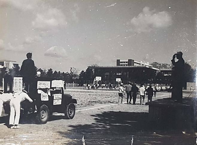 | ▲ 1971년 10월 서울대 공대 축제. 오른쪽 단상 위 공대 학장으로 추정되는 인물이 학생들의 사열을 받고 있다. 학생들이 미는 차량에 '고관은 서민의 피', '특권층', '교련 반대' 등의 문구가 붙어 있다. 윤조덕 원장은 "축제 때 사열을 받는 등 교련을 정식 학점으로 매기면서 대학생들을 마치 군인처럼 대했던 시대였다"라고 회상했다. |