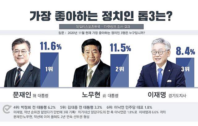 20일 데일리스포츠한국이 창간 7주년 기획으로 여론조사기관 마켓링크에 의뢰해 발표한 여론조사 결과에 따르면 ‘가장 좋아하는 정치인’ 1위는 11.6% 기록한 문재인 대통령이 차지했다.