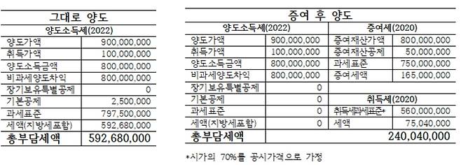 3주택을 보유한 A씨가 2020년 12월 자녀 B에게 조정대상지역에 위치한 가아파트(현재시가 8억원, 1995년 취득가 1억원)를 증여한 것으로 가정했다. 그 이후 자녀 B는 가아파트에 2년 거주를 한 이후 2022년 12월에 9억원에 양도를 하게 되는 경우 A씨가 그대로 보유한 후 양도한 경우와 B씨에게 증여한 이후 양도한 경우의 세부담차이가 어떻게 되는지 보았다.