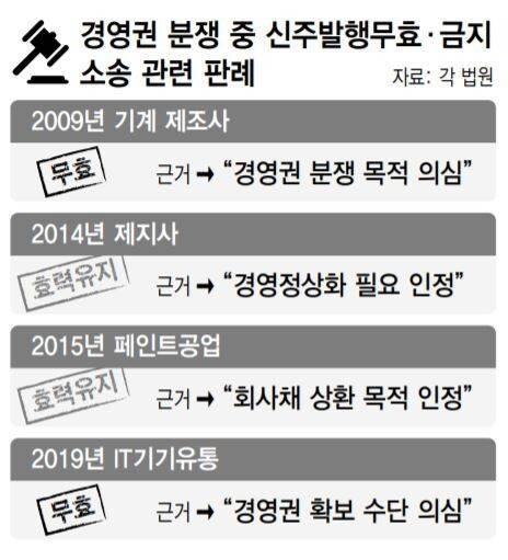 과거 유사 판례를 보면 2009년 경영권 다툼을 벌이던 ㄱ공작기계 제조사는 재무구조 개선 목적으로 제3자배정 유상증자를 실시했지만 법원이 `주주 배정 유상증자로도 목표를 달성할 수 있다'고 봐 신주 발행이 무효화됐다. 지난해 ㄴ컴퓨터유통기기 회사도 재판부가 같은 판례를 인용해 신주를 무효 처리했다. 반면 2014년 경영권 분쟁 중이던 ㄷ제지사가 설비 투자 목적으로 제3자배정 유상증자를 했을 땐 법원이 ‘불가피하다’고 판단해 신주 효력이 유지됐다. 당시 재판부는 ㄷ제지사가 재무개선(워크아웃) 중이어서 노후 설비를 교체할 필요성이 있었고 주주 배정 유상증자는 참여가 저조했을 거라고 봤다. 이듬해 경영권 분쟁 중 신주인수권부사채(BW)를 발행한 ㄹ페인트기업도 ‘회사채 상환 목적’을 적법한 사유로 인정받았다.