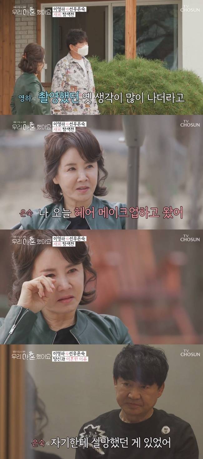 두 사람의 재회 장소는 약 40년 전 첫 데이트를 했던 청평. 선우은숙은 "자기랑 첫 데이트 때가 생각난다"며 솔직한 마음을 전했지만, 이영하는 "작품 촬영했던 게 떠오른다"며 말을 돌렸고, 눈조차 제대로 쳐다보지 못하는 모습을 보였다. 급기야 선우은숙은 "자기한테 예쁘게 보이려고 머리도 잘랐다. 전혀 반응이 없냐"고 돌직구를 날리더니 "자기를 보는데 눈물이 확 난다. 시간이 아쉽지 않냐"며 눈물을 쏟기도 했다.