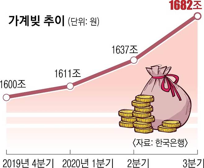 한국은행이 24일 발표한 ‘2020년 3분기 중 가계신용’(잠정)에 따르면 가계신용 잔액은 1682조 1000억원으로, 역대 최대 기록을 다시 갈아치웠다. 전 분기보다는 44조 9000억원(2.7%) 늘었다. 이는 주택담보대출비율(LTV)과 총부채상환비율(DTI)이 완화돼 빚이 폭발적으로 늘어나던 2016년 4분기(46조 1000억원) 이후 두 번째로 많다. 가계신용은 은행, 대부업체, 보험사 등 금융회사에서 빌린 돈(가계대출), 결제 전 카드 사용금액(판매신용)을 더한 것으로 포괄적인 가계부채를 의미한다. 3분기 잔액 기준 가계대출(1585조 5000억원), 판매신용(96조 6000억원)은 모두 역대 최대 규모를 기록했다.