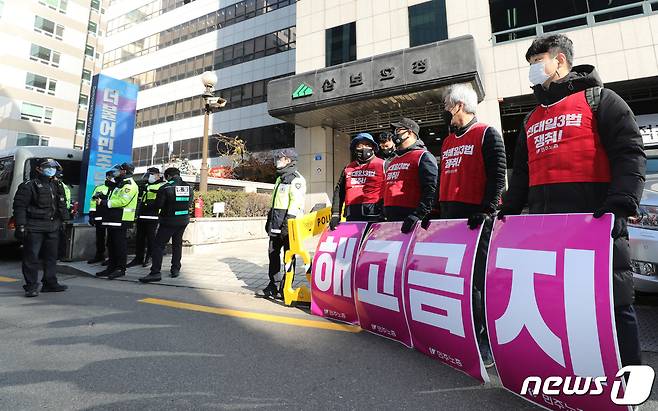 (서울=뉴스1) 박지혜 기자 = 전국민주노동조합총연맹(민주노총)이 신종 코로나바이러스 감염증(코로나19) 확산 우려 속에 노조법 개정 저지 등을 내걸고 총파업을 강행한 25일 오후 서울 영등포구 더불어민주당 당사 앞에서 민주노총 관계자들이 피켓시위를 벌이고 있다.