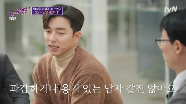 이후 공유는 "자상한 이미지가 있잖냐. 생각보다 무심한 면이 좀 있고 그렇게 살갑지 않다. 오글거려서 잘 못한다. 친하다 생각하는데 가끔 그건 것 때문에 삐지거나 거리감 느껴진다고 말하는 사람이 많다"고 자신의 성격을 설명, "여자분들이 좋아할 타입이 아니다. 사랑 앞에서 과감하거나 용기있는 타입은 아니다"고 말해 눈길을 끌었다. 공유는 캐릭터로선 할 수 있지만 인간 공지철로는 부끄러워 하지 못하는 말들이 많다며 그렇기 때문에 연기로 대리만족을 즐긴다고도 전했다.