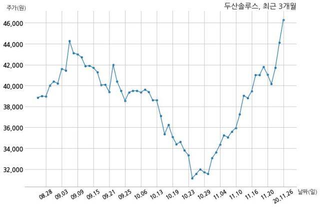 한편, 두산솔루스는 장 마감 이후 해당 기업공시를 발표했으며 오늘 종가가 46,300원, 거래량은 1,026,429주로, 직전 거래일 대비 2,200원(+4.99%) 상승했다.