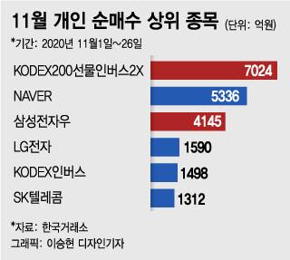 26일 한국거래소에 따르면 이달 들어 개인투자자가 가장 많이 순매수한 종목은 'KODEX200선물인버스2X' (7024억원)으로 집계됐다. NAVER(5336억원), 삼성전자우(4145억원), LG전자(1590억원) 등 대형주를 가뿐히 제친 규모다.