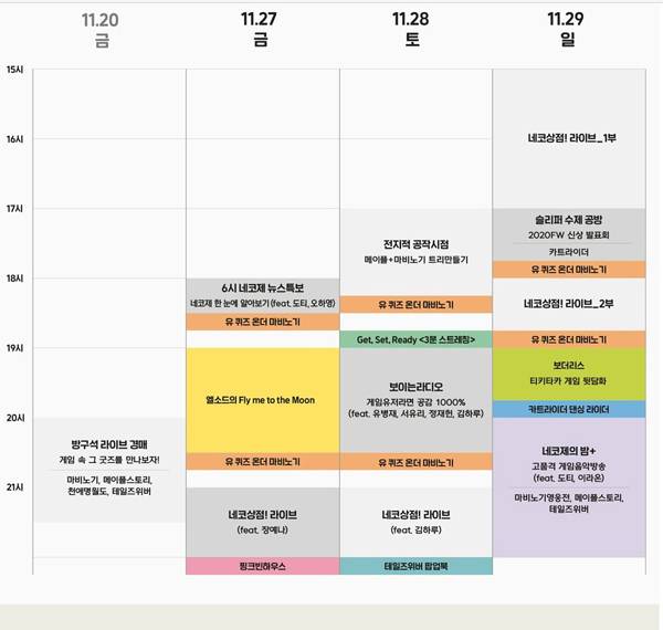 네코제9는 온라인 방송으로 소비자와 직접 소통하면서 유저 아티스트 창작물을 판매하는 네코상점, 넥슨 게임에 얽힌 이용자 사연을 읽어주는 보이는 라디오, 다양한 분야의 전문가들이 게임 이야기를 나누는 '보더리스: 티키타카 게임 뒷담화' 등 온택트 프로그램으로 꾸려진다.