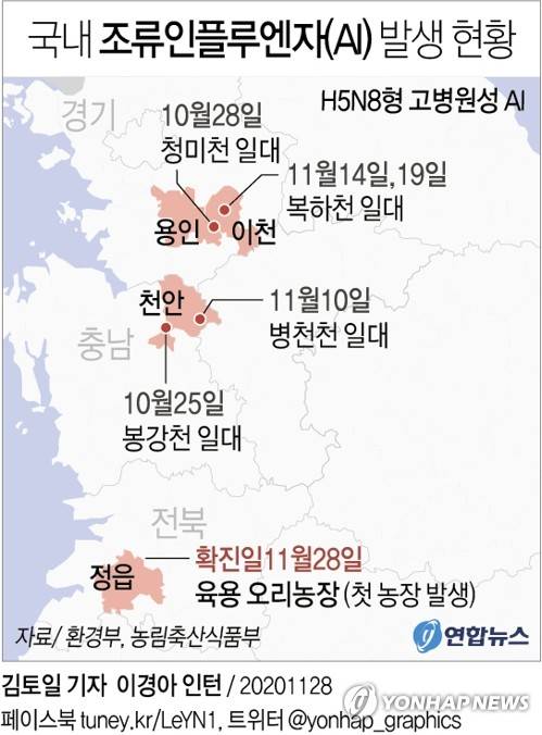 최근 야생조류에서 잇달아 고병원성 AI가 확진됐으나 가금농장에서 감염사례가 나온 것은 처음이다. H5N8형은 앞서 확진된 야생조류의 고병원성 AI와 같은 유형이다.