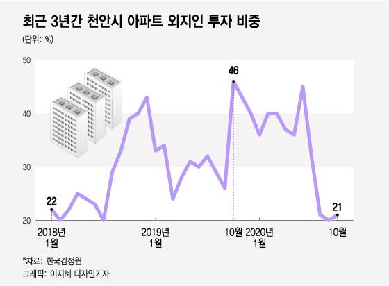 실제 한국감정원에 따르면 최근 3년(2018년 1월~현재)내 천안시 아파트 매매거래 중 외지인의 비중이 가장 높았던 시점은 지난해 10월이다. 전체 2231건의 거래 내역 중 외지인(서울 등 천안 외 기타지역)이 1024건을 매매해 비중이 46%에 달했다. 외지인 투자 비중은 지난 6월 45%를 찍은 뒤 지난 8~10월 20%대로 내려온 상태다.