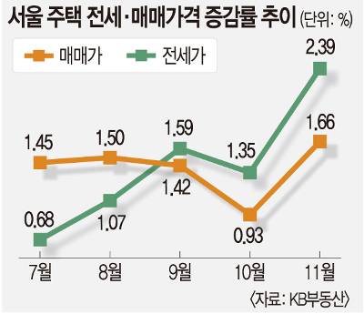 주택(아파트, 연립주택, 단독주택 등) 전체로 확대해도 상황은 마찬가지다. 11월 서울 주택 매매가격 월간 증감률은 1.66%를 기록했다. 7월에서 9월까지 1.50% 안팎의 상승세를 보이다가 10월 들어 0.93%로 떨어졌으나 이달 들어 반전했다.