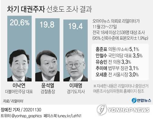 (서울=연합뉴스) 장예진 기자 = 리얼미터가 오마이뉴스 의뢰로 지난 23일부터 닷새간 전국 18세 이상 2천538명을 대상으로 차기 대선주자 선호도를 조사한 결과, 윤 총장에 대한 선호도는 19.8%로 나타났다.