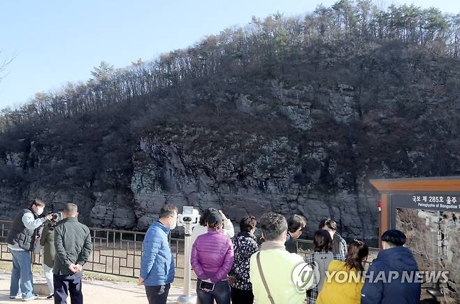 (울산=연합뉴스) 이상현 기자 = 29일 울산시 울주군 언양읍 대곡천 국보 285호 반구대암각화 앞에서 관광객들이 바위그림을 보려고 몰려 들었다. 암각화는 지난 8월부터 3개월간 침수됐다가 지난달 말부터 물 밖으로 나와 현재 제 모습을 갖추고 있다. 2020.11.30