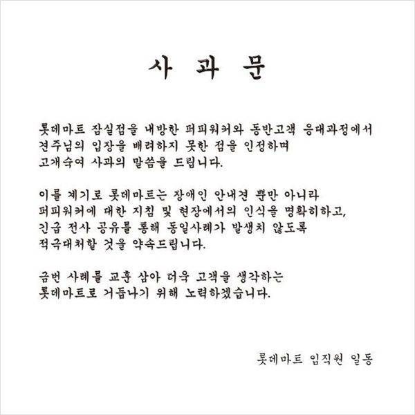 롯데마트 측은 오늘(30일) 오후 1시쯤 공식 SNS 계정에 "잠실점을 내방한 퍼피 워커와 동반 고객 응대 과정에서 견주님의 입장을 배려하지 못한 점을 인정"한다며 사과문을 발표했습니다.
