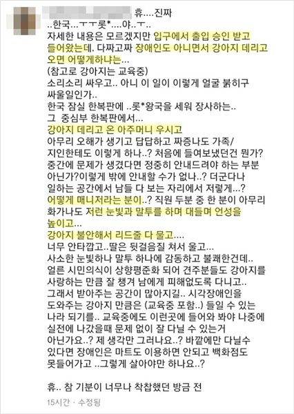 이 글은 하루 만에 일파만파 퍼지며 롯데마트는 거센 비난을 받았습니다. 누리꾼들은 "비장애인에게도 이렇게 무례한데 실제 시각장애인분과 안내견한테는 잘 하겠는가", "국회에도 출입하는 세상인데 뭐 하는 거냐"는 등 댓글을 쏟아냈습니다.