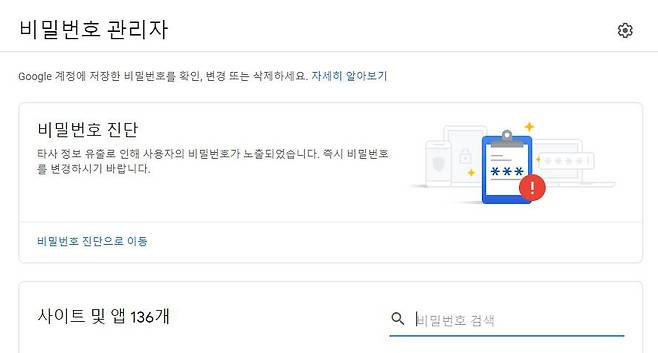 '저장된 비밀번호' 항목에서 비밀번호 보안 상태를 확인한다. 노란색 또는 빨간색 경고 알림이 나타났으면, '비밀번호 진단으로 이동' 버튼을 눌러서 비밀번호가 유출됐는지, 안전성이 높은지, 두 번 이상 사용한 비밀번호가 있는지 확인한다. 본인 인증을 위해 비밀번호를 입력하 후 다음 화면으로 넘어가면, 보안 문제가 있는지 점검한 후 세 개 항목이 나타난다.