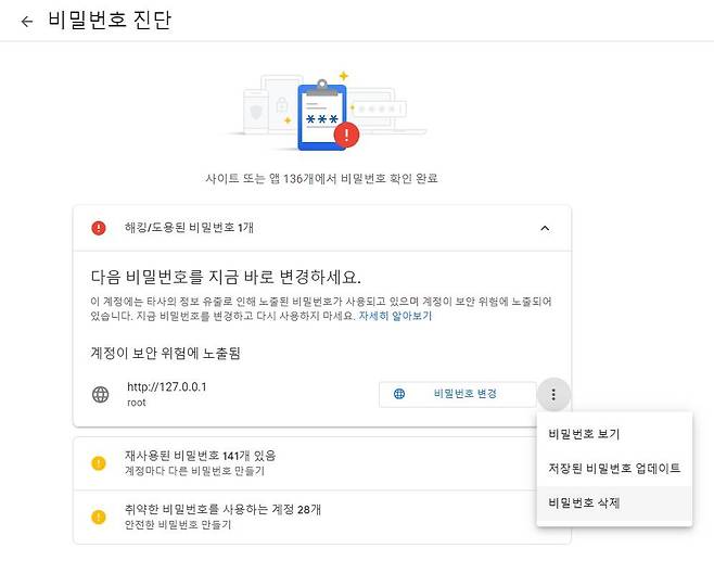 예시는 첫 번째 '해킹/도용된 비밀번호' 항목에 가장 심각한 위험 요소가 있다. 각 사이트 바로 옆 점 세개 버튼을 눌러 '저장된 비밀번호 업데이트' 또는 '비밀번호 삭제'를 선택한다. 두 번째 '재사용된 비밀번호'는 구글 계정에 사용한 비밀번호와 같은 비밀번호를 사용하는 웹사이트 목록이다. 마찬가지로 '저장된 비밀번호 업데이트/비밀번호 삭제'를 통해 안전하게 보호한다.