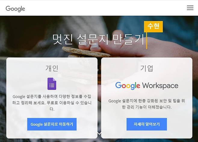 구글 설문지를 실행한 다음, 개인과 기업으로 구분한 설문 기능에서 개인을 선택해서 설문지 홈 화면으로 이동한다. 구글 설문지를 사용하기 위해서 구글 설문지 사이트에 접속한다. 검색 사이트에서 '구글 폼’ 또는 '구글 설문지’를 검색한다. 구글 폼으로 검색해도 'Google 설문지’가 검색 결과로 나타난다. 온라인 설문 조사가 가능하고 무료로 제공한다는 설명이 적혔다.