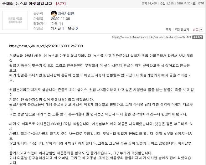 끝으로 "아랫집에서 한 번이라도 올라오셨던 집이 있다면 그 집은 그 한 번 시끄러워서 올라온 게 아닌 속으로 수천 번을 참고 싸움이 날까 두려움을 넘고 어렵게 올라왔다는 것을 생각해 주셨으며 한다"며 "제발 좀 층간 소음이 뭐 대수냐고 생각하지 말아달라"고 당부했다.