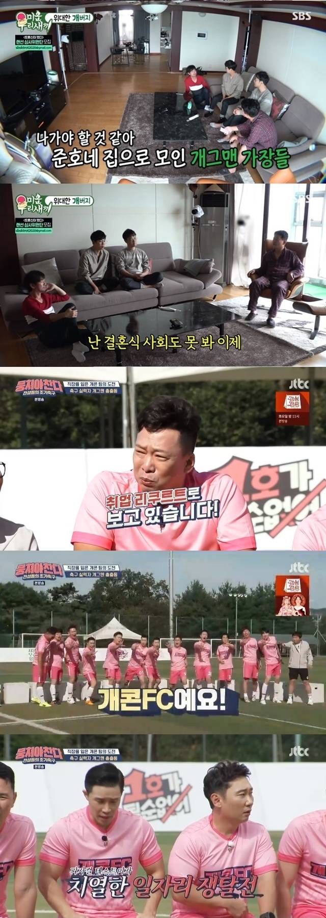 공교롭게도 '미운 우리 새끼' 김준호 편과 같은 날 방송한 JTBC '뭉쳐야 찬다’에선 '개콘' 출신 코미디언들이 구직을 위한 절실한 각오로 어쩌다FC와 축구대결을 펼쳤다. 오랜만에 TV 출연 소식에 기뻐하는 코미디언들을 보며 마냥 웃을 수만 없었다.