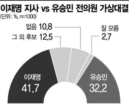 아시아경제가 윈지코리아컨설팅에 의뢰해 지난달 28~29일 전국 18세 이상 유권자 1000명을 대상으로 여론조사(휴대전화 가상번호 100%ㆍ자동응답)를 실시한 결과 '차기 대선에 이 지사와 유 전 의원이 나선다면 누구를 지지하겠느냐'라는 질문에 이 지사는 41.7%, 유 전 의원은 32.2%로 이 지사가 9.5%포인트 앞서는 것으로 집계됐다.