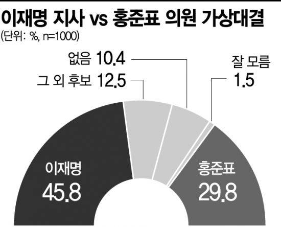 이 지사와 홍 의원의 가상 대결에서는 격차가 더 벌어졌다. '차기 대선에 이 지사와 홍 의원이 나선다면 누구를 지지하겠느냐'라는 질문에 이 지사는 45.8%, 홍 의원은 29.8%로 이 지사가 16%포인트 앞서는 것으로 나타났다.