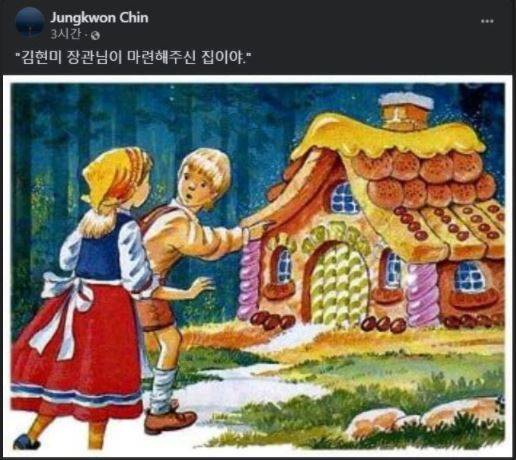 진중권 전 동양대 교수는 동화 ‘헨젤과 그레텔’ 속에서 헨젤과 그레텔이 빵으로 만든 집으로 향하는 삽화를 페이스북에 올리며 “김현미 장관님이 마련해 주신 집이야”라는 글을 달았다.
