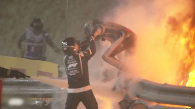 시뻘건 화염 속에 홀로 남겨진 그로장 선수, 그런데 약 30초 뒤 이렇게 스스로 펜스를 넘어서 기적적으로 탈출에 성공했습니다.