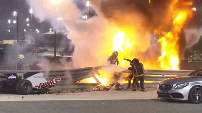 로맹 그로장이 몰던 차는 이날 직선 구간에서 앞차와 충돌한 뒤 보호 펜스에 한 번 더 충돌하고 곧바로 폭발해 두 동강이 났습니다.